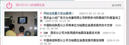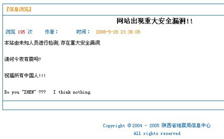 28日23時38分,記者正常登錄到陜西省地震局網站(陜西省地震信息網)時,在該網站首頁“四川汶川8.0級地震應急”欄目中發現一條題為“網站出現重大安全漏洞”的信息,點擊進入后內容顯示“本站由未知人員進行檢測,存在重大安全漏洞”,并隨后附有三條“網友留言” 。