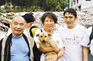 通過智富,“愛之家”找到了黃色雜有黑毛的中華田園犬“前進”和黃白色長毛、背上有一撮黑毛、不足一歲的喜樂蒂狗“乖乖”。徐先生說,在將“前進”和“乖乖”帶離災區(qū)時,當?shù)睾芏啻迕穸技娂妵蟻硪蠛蛢芍弧傲x犬”合影。