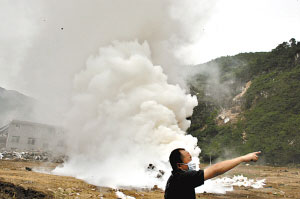 昨天下午,本報記者一行四人結(jié)束北川縣城的采訪返回擂鼓鎮(zhèn),在3時35分左右,突然發(fā)現(xiàn)道路被濃密的白色煙霧所籠罩,煙霧還順著風向向北川縣城方向擴散,多名災民捂著鼻子從濃煙中跑出來,兩名身穿白色防化服的工作人員緊急從馬路對面跑到防疫站求救。短短兩分鐘,記者喉嚨、眼睛明顯有刺激感,喉嚨發(fā)癢,似有痰難以吐出。部分災民紛紛走出帳篷慌張跑開。