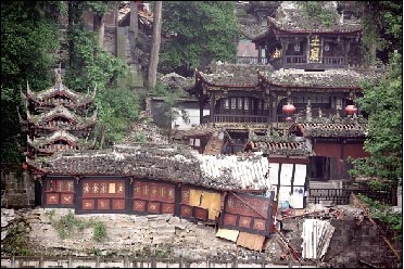 震波未消,周川好甩開(kāi)同事,發(fā)了瘋似的向飛沙堰的觀景亭跑去。20余分鐘后,他跑到目的地,看到玉壘山山腰上的二王廟,開(kāi)始整體滑移和下沉。掩映在樹(shù)木中的紅墻黑瓦,化作一片狼藉。