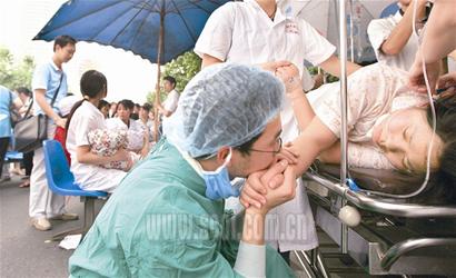 市民們和醫(yī)生心手相連的場(chǎng)面打動(dòng)了每一位路人,也刺激著我的快門(mén)不停響動(dòng)。透過(guò)人群中的縫隙,一幕畫(huà)面深深地打動(dòng)了我的心靈,只見(jiàn)一位身穿手術(shù)服,頭戴消毒帽的年輕男子正蹲在一臺(tái)擔(dān)架車(chē)旁,握著一位虛弱的產(chǎn)婦的手,無(wú)言地對(duì)視著,他們正等待著小生命的降臨。突然,男子將她的手放在唇邊,輕輕一吻,就像在說(shuō):老婆,你不要怕,一定不會(huì)有事,我們的孩子會(huì)平安降生。按動(dòng)快門(mén)的同時(shí),淚水滑過(guò)我的眼眶。