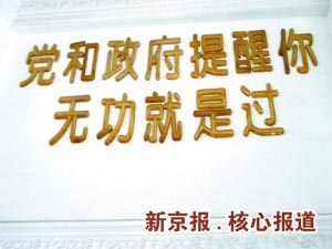 在潁泉區政府辦公樓大堂里貼著的宣傳口號。 記者 黃玉浩 攝