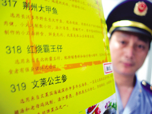 進入飯店包間,服務員立刻把餐桌中央的一份菜單席卡遞了過來。“這些都是我們的特色精品菜,來我們這里的沒有人不點這些。”服務員介紹說。