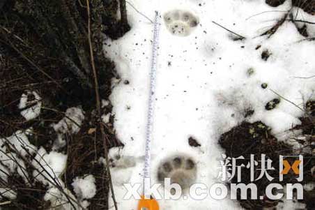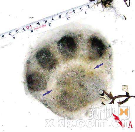 劉里遠對此也作了解釋:從照片(見圖)可見前面那四個腳趾都不同程度地向前凹進。這是因為老虎在抬腳時,先抬起腳跟和腳掌,并且整個身體向前移動,則其腳趾尖在雪中向前推進,形成那樣的內突凹陷。另外,我們還看到腳印的前沿有一明顯的缺口,顯然是虎腳最后離開時拖拽而成。劉認為這是一個典型的行進中的老虎腳印,幾乎是不可能人工模擬出來的。