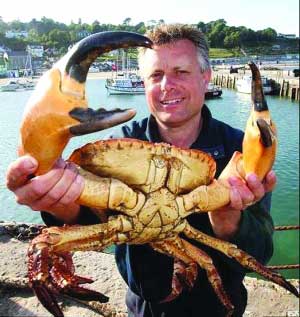 英國白金漢郡愛斯勃雷市潛水員保羅·沃斯利在多塞特海岸的利米灣潛水時(shí),竟然在48米深處的一艘戰(zhàn)艦殘骸下發(fā)現(xiàn)了一只重達(dá)7.7公斤、寬達(dá)30厘米的“妖怪螃蟹”!沃斯利冒著危險(xiǎn)將這只“超級(jí)螃蟹”捉上了水面,專家相信,這只螃蟹是全世界曾經(jīng)捕上岸來的最大可食用螃蟹。