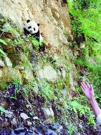 近日,馬先生一行5人來到太白縣考察生態(tài)農(nóng)業(yè)項目,7月5日上午,他們從太白縣城出發(fā),前往黃柏塬鄉(xiāng)。上午10時30分許,車駛出30多公里時,馬先生看到路邊有群人圍著什么東西,順著眾人的視線看到,離地面大約4-5米的崖壁上竟有一只大熊貓。一行人喜出望外,他們從來沒有想過自己還有緣看到野生大熊貓,于是放下手頭的工作加入到守護大熊貓的行列中。