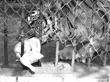 十指連心,動(dòng)物也不例外。虎掌鋸爪,猶如虎口撥牙。要想成功為“園園”實(shí)施剪指甲手術(shù),必須實(shí)施麻醉。前日上午10時(shí),技術(shù)人員趁“園園”不備,用長(zhǎng)竹竿綁上一顆大針頭,將4只陸眠靈麻藥快速推進(jìn)虎體。15分鐘后,“園園”雙眼時(shí)閉時(shí)睜伏在地上。不料,30分鐘后,“園園”突然起身,東倒西歪地走了起來(lái)。“看來(lái)藥量太輕,未能完全將它麻醉。”10時(shí)38分,技術(shù)人員為“園園”補(bǔ)了一支麻藥,體重約150公斤的東北虎,兩腿一軟倒在地上再也爬不起來(lái)了。2名工作人員抓住時(shí)機(jī),快速將“園園”的右腿拖出鐵欄外,并用繩索牢牢捆綁住虎掌,用鋼絲鉗將虎爪因定。只聽(tīng)一陣“嘩!嘩!嘩”的拉鋸聲,一名工作人員就像鋸鋼管一樣,奮力朝著虎爪的第二只指甲猛鋸。“嗡!嗡!”就在工作人員即將鋸掉首枚虎爪時(shí),劇烈的疼痛感將休眠中的“園園”痛醒,連續(xù)發(fā)出兩聲怒吼的同時(shí),全身一陣猛抖,欲掙脫束縛拖回被綁的右掌。然而,5支麻藥的藥效已使此時(shí)的東北虎有心無(wú)力,徒勞一陣后進(jìn)入夢(mèng)鄉(xiāng)。