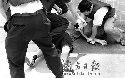 在對抓獲的兩名犯罪嫌疑人審訊期間,聯合專案組掌握到該團伙另一名成員“阿文”藏匿在松崗街道某旅店。11時許,“阿文”察覺遭到警方圍捕,在松環路美食街附近先后持槍劫持兩名男子和一名女子作為人質。聯合專案組民警立即組織疏散群眾,同時與嫌疑人周旋。“那個歹徒很囂張,不斷地叫喊,來了近百名警察把他圍了起來,場面很緊張,我都叫我老婆趕緊離開。”目擊者關先生心有余悸地說。