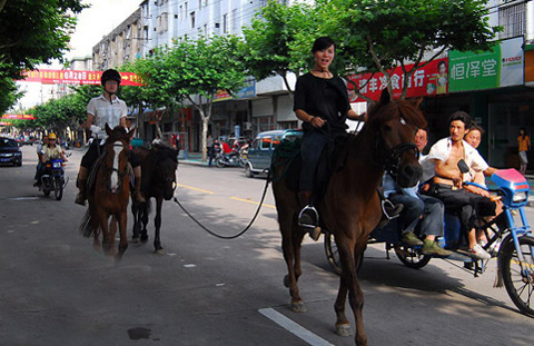 連日來的傍晚時分,只要天氣晴好,(浙江)諸暨最繁華的街區就會出現這樣一副場景:兩三名時尚男女,身穿騎師服裝,騎著高頭大馬,旁若無人地在車流中穿行。途經之處,總引得好奇市民拿起手機、相機一通抓拍。
