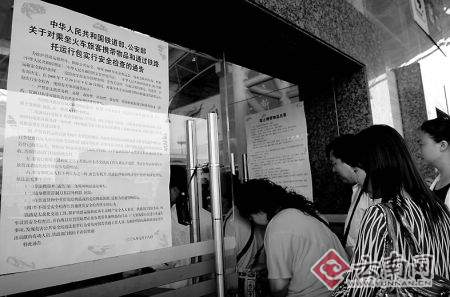 奧運會即將召開之際,昆明發生的公交車爆炸案,繃緊了公共交通工具的安全神經。昨日,民警和保安在昆明火車站四處張貼了一份通告,按照所張貼的鐵道部和公安部聯合發出的最新通告,從現在至9月20日,對旅客乘坐火車攜帶物品和通過鐵路托運行包必須實行安全檢查,菜刀、大型水果刀、剪刀、斧子、錘子等利器、鈍器一律放入行李中托運。通告指出,對拒絕接受安全檢查或堅持攜帶違禁物品的旅客,鐵路部門可禁止其進站乘車。