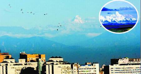 吳傳明將拍到的照片發(fā)到網上,在照片上可以清晰地看到:透過城市樓宇,蔚藍的天幕下出現了一大片群山。在群山深處,一座潔白的雪峰巍然矗立。尖利的山峰直刺云霄,圍繞在雪峰下的白云清晰可見……