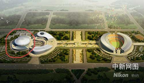 圖為濟(jì)南奧體中心設(shè)計(jì)效果圖,圖中紅圈所示即失火的體育館。