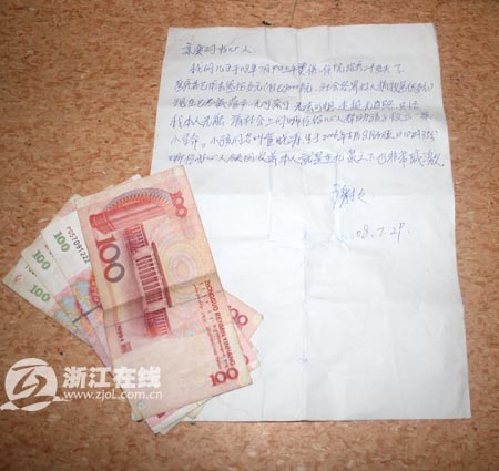 “今天早上查房的時候,我們發現曉濤的家長一個也不在。先還以為他爸爸上班去了,但后來在他床頭發現了這樣一個信封。”省兒保燒傷整形科的值班護士遞給記者一個信封。拆開一看,里面有一封曉濤父母的手寫書信和四百元人民幣。在信中,他們稱為曉濤治病已花去4萬余元,其中自己的積蓄有8000元(還有三萬余元來自捐款),目前已經傾家蕩產、無能為力,故希望社會上有好心人能收養自己的兒子。