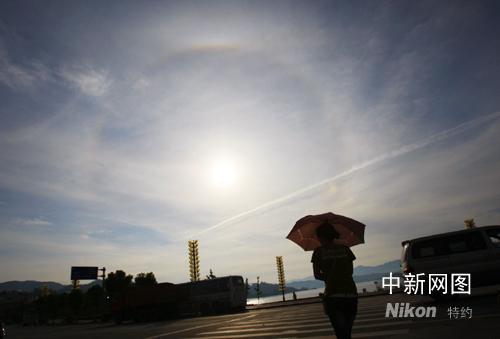 中新網(wǎng)杭州8月6日電(見習記者 張潔 通訊員 程賢高)“月暈三更雨,日暈午時風”。2008年8月6日上午7時左右,在杭州市淳安縣千島湖畔,剛升上山際兩丈許的太陽周圍出現(xiàn)了較為明顯的彩色暈環(huán)。在氣象上,這種暈環(huán)就是“日暈”,是不太多見的大氣光學現(xiàn)象,預示著天氣將出一定變化。(完)