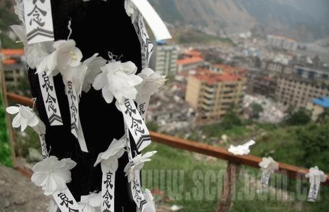 在一個被當(dāng)?shù)厝朔Q為“三倒拐”的地方,鐵血四十師在此拉起了一方橫幅:沉痛悼念北川遇難同胞。橫幅下面擺放著一個大的花圈,花圈兩邊分別是假花拼成的“5·12”和“北川”字樣。橫幅下的欄桿上,密密麻麻貼著寫有“哀悼”二字的小紙條,每一個紙條,代表著一個亡靈。