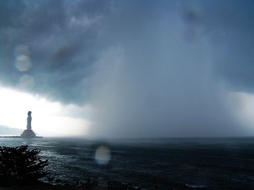 據(jù)目擊到“龍吸水”奇觀的南山景區(qū)工作人員介紹說,今天上午10時許,在南山寺觀海平臺處正南方海面上空突然出現(xiàn)一團烏云,云團一角懸掛著一條形似“龍尾”的烏云斜插入遠邊的海平線。接著,“龍尾”烏云在海面上漸漸吸起一層海水,沖起約百米高的巨大水柱,一時間水柱和天上的烏云連接在一起。隨后,這團烏云和水柱向108米南海觀音像方向移去。這“龍吸水”的奇觀持續(xù)約10分鐘。