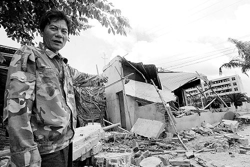 “為了讓我們乖乖交出‘保護(hù)費(fèi)’,這伙人不僅打了工人,還在光天化日之下開(kāi)著推土機(jī)推倒了我們的房子。”前天上午,在東方市八所鎮(zhèn)十字路東100米處一家摩托車修理店門前,小嶺村村民張用良?xì)鈶嵉卣f(shuō)。