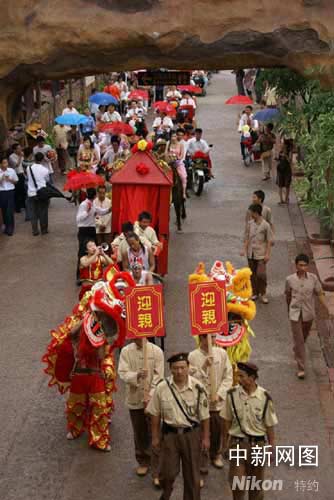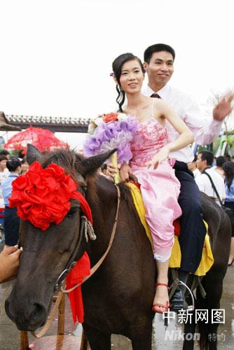 中新網順德9月23日電 (孫建駒 謝俊忠)大鼓擂響,嗩吶聲聲,一支百余米長的迎親隊伍中,有高頭大馬、花轎和卡丁車、電瓶車、摩托車、沙灘車、自行車等交通工具,隊伍熱鬧穿越廣東順德長鹿農莊,28對新人在這里舉辦別具水鄉特色集體婚禮。