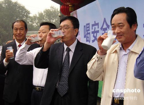 9月25日,石家莊市副市長張殿奎(右二)帶頭將滿滿一大杯某品牌純牛奶一飲而盡,隨行的石家莊市工商局、質量技術監督局、商務局等相關部門負責人也紛紛效仿,將手中品牌各異的滿杯純牛奶全部喝下,以消除此間民眾因三鹿問題奶粉事件而產生的顧慮。中新社發 牛琳 攝