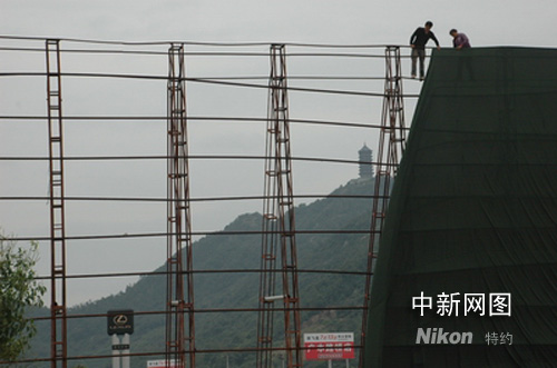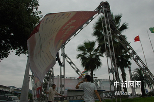 工人在浙江臺州一國慶車展現場加固施工,以應對超強臺風“薔薇”的到來。作者:陳林聰