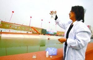 昨日,北拒馬河暗渠工程現場,一名工作人員正在監測水質。記者 薛珺 攝