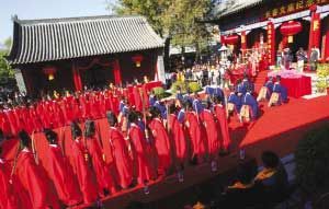 “今年的祭孔活動很多地方與歷年有所不同。”據工作人員介紹,今年的祭品一改每年的三牲祭祀,祭品用直徑1.5米的生日蛋糕,以呈現現代祭孔的特點。記者在大典現場了解到,今年的祭孔大典還適逢文昌閣暨國學大講堂工程竣工,文昌帝君像也揭開神秘面紗,正式落戶長春文廟。由各地傳統文化愛好者捐贈的大型孔子圣跡圖碑刻,工程歷經3年之久,也以壯觀的場面頒上圣墻,精彩再現先師教育風范。此外,今年的祭孔表演,在保持著每年的大型仿古祭孔樂舞的基礎上,還為觀眾獻上一臺精彩的大型箏樂和漢服箏舞。活動現場,長春文廟還免費向參禮群眾發送傳統蒙學讀物《弟子規》及新儒學兒童讀物《海叔的禮物》。(記者 齊晟博)