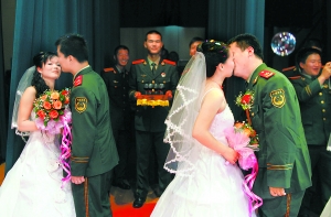 “非常有紀念意義。”上午9時,警官王忠燦摟著他美麗的新娘,開心地評價著即將開始的集體婚禮。9時25分,包括王忠燦在內的21名武警北京總隊十三支隊的新郎官,分別背著他們的新娘,登上貼著喜字的大轎車。在威風鑼鼓的喜樂中,悍馬指揮車引導著婚車,緩緩向警營駛去,一場別開生面的集體婚禮開始了。