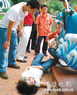 “有人墜地了!”周?chē)懫鸾泻奥暋?ㄔ诒kU(xiǎn)杠和座位之間,身子懸在半空的凌澤坤這才發(fā)現(xiàn),李鳳躺在游藝機(jī)旁邊的地上。游藝機(jī)經(jīng)過(guò)一圈減速后,很快停下來(lái)。凌澤坤趕到李鳳身邊,只聽(tīng)見(jiàn)李鳳說(shuō)聲“頭痛”就昏過(guò)去。動(dòng)物園管理人員和傷者家屬一起把傷者送到九龍坡區(qū)第一人民醫(yī)院接受治療。