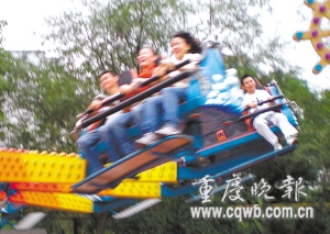 李鳳(右一)和同事們坐游藝機(jī)飛到空中。(圖片來(lái)源:重慶晚報(bào))
