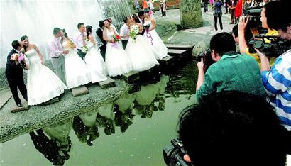 “人太多了,簡直搞混了。新娘都吻錯了。”浪漫擁擠,新人更是擁擠,王海(化名)就是眾多新人中的一分子,昨日鬧了個大笑話。“幸好只有自己的親人認(rèn)識我,否則面子丟大了。”王海不好意思地說,在混亂中有人提議新人集體擁吻,大家當(dāng)場答應(yīng)配合,但在混亂中,由于新娘都穿的是白色婚紗,自己竟然吻了別人的新娘,搞錯了對象。