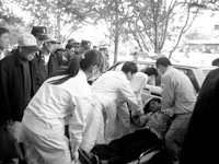 昨日16時10分,120急救車趕到現場,醫護人員用擔架將該男子抬上救護車(見圖)。但青年男子的同鄉們拒絕隨同急救車前往同仁醫院,而是守在原地不讓城管的執法車輛離開。經民警上前調解后,他們才離開現場。