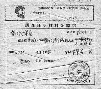 “那個年代的中國人,沒有介紹信寸步難行。1971年,黃梅縣文化館有機會去武漢參加文藝演出放電影,同事小袁老家在武漢,我們就讓他拿著介紹信帶著膠片去了。沒想到小袁把介紹信揣在兜里,洗衣服時給洗壞了。正巧遇上工人糾察隊,小袁拿不出介紹信,被當作‘黑戶’給糾察去,單位領導趕去才把他接出來。”