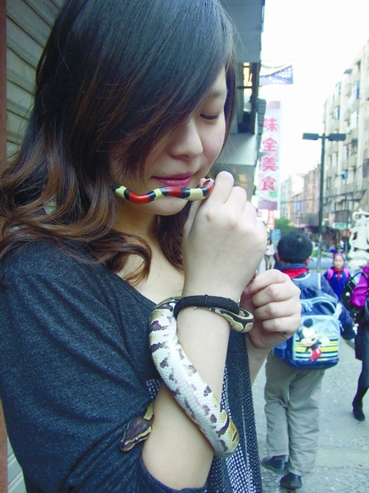 如果在大街上看到寵兒,你一定會覺得她是一個時尚、貌美的美女。如果你仔細一看,發現她的手腕上纏著一條色彩斑斕的蟒蛇,會不會立刻將你“雷”倒呢?如今在省城合肥,有不少像寵兒一樣的美女帥哥,他們已經不屑于養小貓小狗這樣的平常寵物,而是將各種各樣的蛇當作自己的“另類寵物”,甚至和蛇同床共枕,卿卿我我。記者昨天就采訪了這樣幾位“都市潮人”。