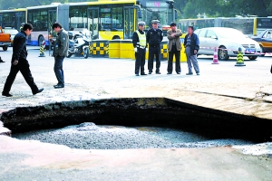據(jù)目擊者王先生稱,今晨6時(shí)許他騎車路過(guò),發(fā)現(xiàn)該路面已經(jīng)發(fā)生了沉陷,大坑內(nèi)土層持續(xù)滑落,還伴有沉悶的轟隆聲,好在當(dāng)時(shí)無(wú)車輛和行人經(jīng)過(guò)大坑上方。事后搶修人員很快趕到,現(xiàn)場(chǎng)維持秩序的交警也拉起警戒線,并到路口阻攔過(guò)往車輛。