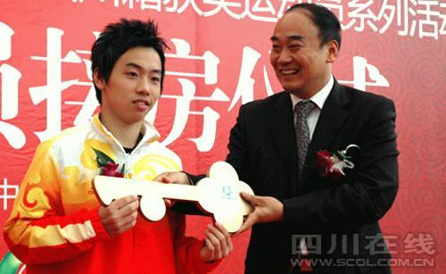 昨天上午的成都溫江金強(qiáng)大學(xué)城廣場前熱鬧非凡,四川省體育局在此表彰北京奧運(yùn)會上奪牌的川籍運(yùn)動員。鄒凱、呂遠(yuǎn)洋、陳朝霞、張益萌、蔣婷婷、蔣文文和王娜等在北京奧運(yùn)會上為四川爭光添彩的運(yùn)動員接受了由某房地產(chǎn)商贈送的住房。其中,獨(dú)攬三金的“體操王子”鄒凱開心地接過了一套近200平方米躍層住房的鑰匙,而帆板金牌得主殷劍則獲得一套三居室住房,此外,獲得北京奧運(yùn)會銀牌和銅牌的四川選手也分別獲得套二和套一的住房。