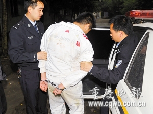 至昨下午4時許,南岸警方結束對被抓獲男子的突審,移交南川警方。男子身穿一套白色運動服,脖戴1條很粗的金項鏈。(首席記者 黃艷春/文 記者 冉文/攝 郭娟/制圖)