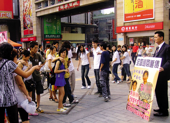 記者接報來到上下九廣場,果然見一男子西裝革履,手舉一塊半人多高的塑料牌,上面印有欠款方“南方某房地產(chǎn)開發(fā)公司”的兩位負責(zé)人曾某及肖某的照片和姓名,上面赫然寫著“全國巡回追債”,并不忘交代自己的身份“中國搖滾領(lǐng)袖毛杰東”。