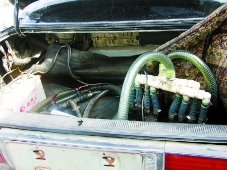 “為了避人耳目,大鐵箱被用布蓋著。鐵箱上連著直徑有5厘米粗、內有鐵絲的硬質塑料管,五六米長的管子上安裝有閥門、連接有油泵、進出油過濾油器、開關等。原來轎車就是用這根‘長鼻子’把大貨車的油偷走了。”李靖明說。