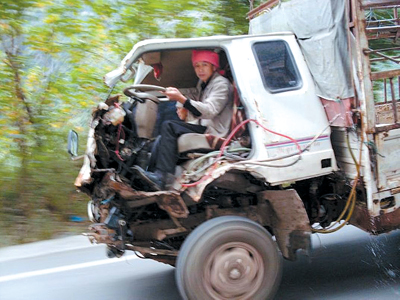“我當(dāng)時(shí)都嚇慘了,正當(dāng)目瞪口呆的時(shí)候,駕駛員竟然還對著我們車上的乘客笑,坐在副駕駛的女子也若無其事。”陳說,當(dāng)時(shí)貨車開得很快,車身搖晃不已,里面的零件都像要飛出來了,駕駛員隨時(shí)都有可能從車?yán)餄L到公路上。客車超過貨車之后,在其前面停下,陳先生等人攔下貨車。據(jù)“腦殘車”駕駛員介紹,他駕駛的長安貨車與一輛大貨車相撞,由于貨車“沒有受到大的損壞”,還可以繼續(xù)行駛,他便將車開回家。