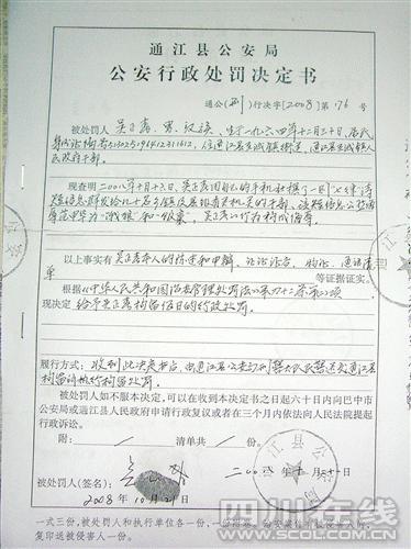 10月16日下午4時左右,巴中市通江縣部分鄉鎮和部門主要負責人,均收到了一條“奇怪”的手機短信,發信人使用的手機號碼為1308432××××,內容就是這則看上去有些“蹩腳”的順口溜。很快,發短信的人被當地縣公安局以其行為“構成侮辱”,處以行政拘留5日;緊接著,通江縣紀委也作出決定,對作者處以留黨察看兩年,并全縣通報。此事在通江乃至巴中鬧得沸沸揚揚。據悉,當地縣里一位主要領導的名字就是題目“賀飯(范)生(申)花(華)”中的范申華。本報記者前往通江進行了詳細調查。