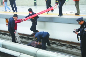 工作人員準備將墜軌身亡女子運離。昨日上午,一名女子在地鐵13號線柳芳站墜軌身亡。13號線運行受影響,柳芳站臺一度封閉,約半小時后恢復正常。有目擊者稱女子系跳下站臺。警方已介入調查。本報記者 王申 攝
