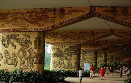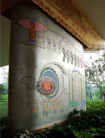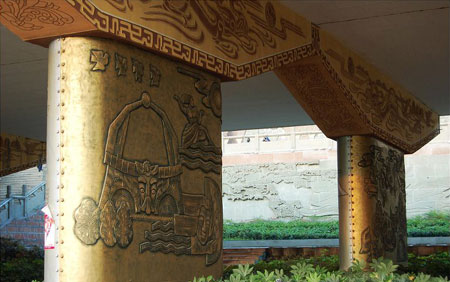 據(jù)有知情網(wǎng)友透露,這座“史上最牛的橋墩”來(lái)自四川德陽(yáng)市鼓樓下的成綿高速高架橋橋墩。橫亙?cè)诠臉桥c廣場(chǎng)之間的高速公路橋墩,成了設(shè)計(jì)者發(fā)揮想象的地方。設(shè)計(jì)者將28個(gè)橋墩進(jìn)行裝飾改造,以仿古浮雕銅板扣畫和仿敲銀浮雕扣版畫及大型仿烙鐵裝飾畫體現(xiàn)德陽(yáng)6縣(市、區(qū))歷史文化、風(fēng)景名勝、人文景觀及重裝基地風(fēng)采。整個(gè)壁畫長(zhǎng)廊立體感極強(qiáng),既抽象又寫實(shí),色彩明朗,極具現(xiàn)代藝術(shù)風(fēng)格。彩虹橋、石刻、白馬關(guān)、龐統(tǒng)墓、倉(cāng)山大樂(lè)、黃繼光紀(jì)念館、三星堆、年畫館、劍南春……德陽(yáng)的標(biāo)志一一在此得以展現(xiàn),每個(gè)篇章把歷史文化、風(fēng)景名勝、人文景觀融為一體,形成一個(gè)完整的壁畫群落,壁畫面積達(dá)2309平方米,是整個(gè)德陽(yáng)地區(qū)景點(diǎn)的微縮。“史上最牛的橋墩”于2007年初推出,并受到當(dāng)?shù)仡I(lǐng)導(dǎo)的表?yè)P(yáng)。