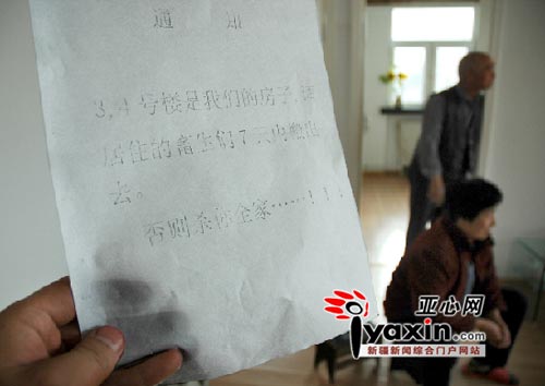 造成這一現象的原因是由于十天前,此小區里突然張貼了十幾張通知,內容很恐怖:如果三、四號樓的住戶不搬家,就殺他全家!!!昨日此新聞在亞心網上發布之后,立即被全國各大網站轉載,影響力非常之大,網民的反應也相當強烈。基于強大的社會輿論壓力,前期一直不肯露面的星云房產公司接受了亞心網記者的采訪。