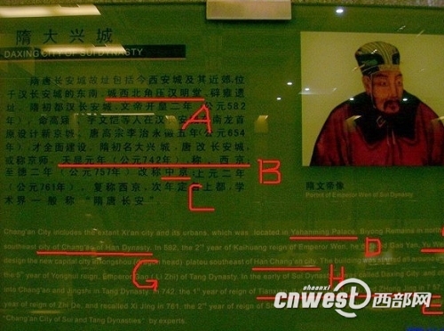 在介紹到隋朝歷史時,展板上的文字說明寫到:“Daxing City of the Sui Dynasty”(公元581-681)……”,且不論翻譯是否正確,這隋朝的滅亡時間怎么就從公元618年推遲到公元681年了?生生是讓隋朝遲亡了63年,而這時,唐太宗李世民(公元598~649)都已經死了。在另一處說明中這樣寫道:“天顯元年(公元742年)……”,其一,“天顯”年號跟隋唐根本沒有任何關系,而應該是遼太祖耶律阿保機的年號;其二,742年應該是“天寶元年”。