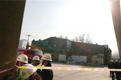 昨天上午8點(diǎn)多,100多名男子列隊(duì)將位于豐臺(tái)路口的“福成肥牛”飯店緊緊包圍。這些人均著統(tǒng)一服裝,部分人頭戴標(biāo)有“城市管理”字樣的白色頭盔,身著深藍(lán)色大衣;部分人全身迷彩服。3輛鏟車和消防車也開到飯店門前。拆遷者還用警戒線將飯店圍住。