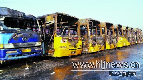 21日清晨,在哈市香坊區薛家屯208路公交車終點站停車場內,一輛雙燃料公交車點火啟動時,由于工人違章操作致化油器回火并引發火災,停放在該車兩側的8輛公交車和1輛貨車被殃及。