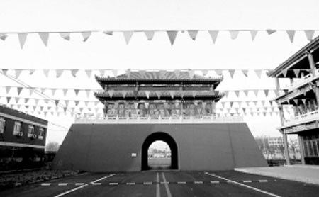 昨天,在位于通州區(qū)土橋新橋東側(cè)大約500米處皇木廠村村口,記者看到了這座仿古的城門樓——整座門樓至少30米高,樓身為紅色,只有一個門洞。