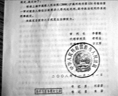 她稱,7點左右,來了兩個上海高級人民法院的法官,向她送達了最高法的刑事裁定書。該文的簽發日期是11月21日。文中核準了上海市高級人民法院的二審判決。