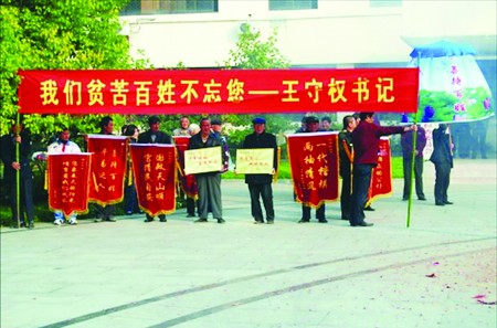 帖子出現在網友“西楚刀客”的博客上。整篇文字介紹了發生在兩個星期前江蘇省泗洪縣政府樓前的“感人的一幕”:11月13日一大早,數百名群眾自發地排著整齊的隊伍,抱著銅匾,撐著“萬民傘”,打著“清官旗”,集中在泗洪縣政府門前,長長的一串鞭炮發出震耳欲聾的響聲。在這支隊伍里,有老人,有殘疾人,有打工仔,有下崗工人……每個人都在期盼著能再見見他們的恩人——王守權……得知王書記調走的消息,當地群眾用一種最古老的感恩方式——萬民傘和清官旗,來為他送行。