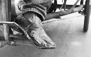 行駛14天后,摩的司機的皮鞋已磨破。